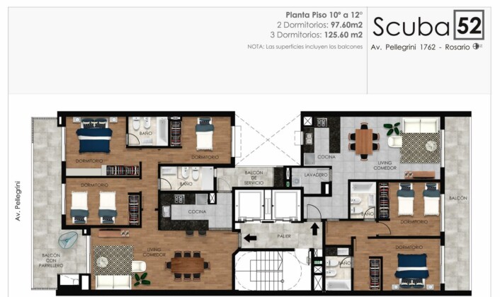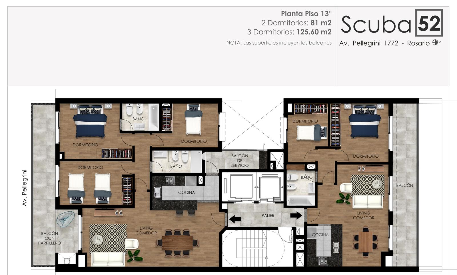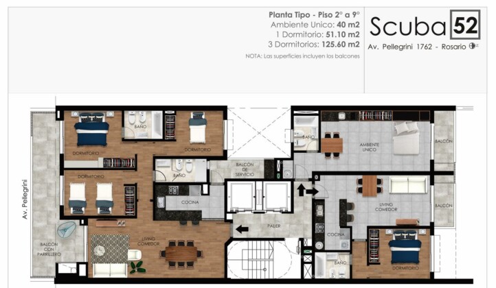 Ubicado sobre Av. Pellegrini, una de las principales arterias de la ciudad de Rosario y tradicional corredor gastronómico. Edificio con 13 plantas de uno, dos, tres dormitorios y monoambientes. Dos niveles de cocheras con un enchufe de cargador para auto eléctrico por planta.