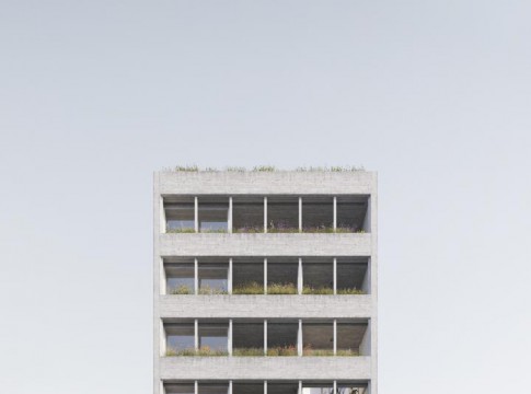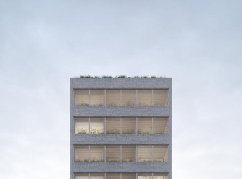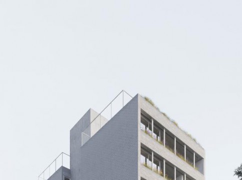 El edificio se proyecto como un contenedor con una cascara compacta y solida que nos proteja de las problemáticas de la ciudad. Compuesto por tres crujías perpendiculares a la calle que a su vez están divididas y vinculadas por el núcleo vertical, formando dos volúmenes espejados.