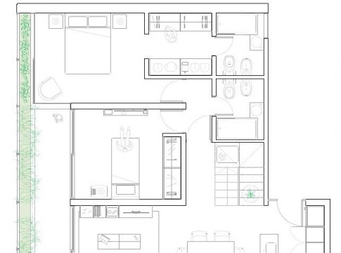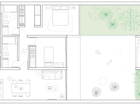 El parapeto de los bacones se materializa con un cantero, sumando un colchón vegetal, que hace de filtro, aporta naturaleza, y protege a la segunda cara de vidrio del asoleamiento del norte.