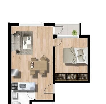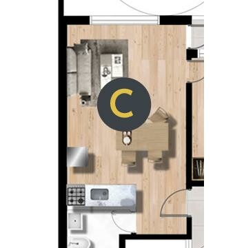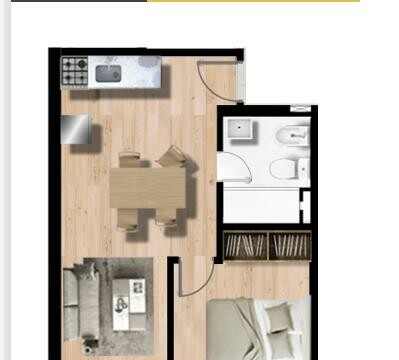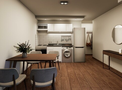 Se desarrolla en planta baja local comercial y acceso a cocheras. Unidades monoambientes y 1 dormitorio.