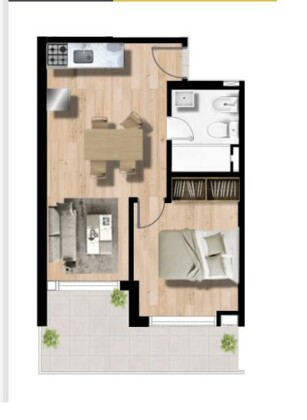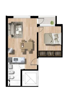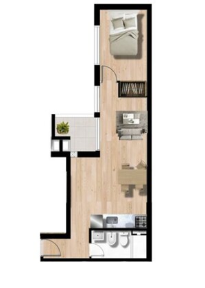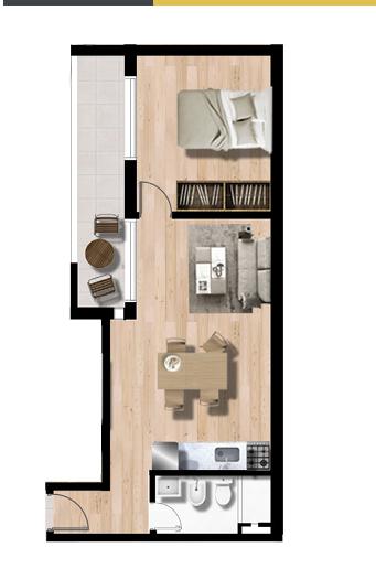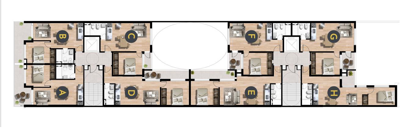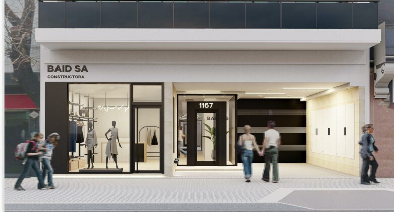 Se desarrolla en planta baja local comercial y acceso a cocheras. Unidades monoambientes y 1 dormitorio.