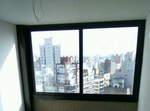 Aberturas de aluminio negro con vidrios DVH tonalizados gris.