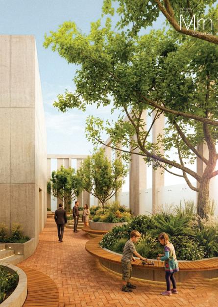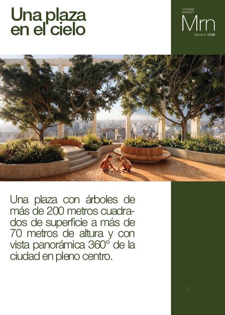 El proyecto se completa con un espacio único en altura: una plaza arbolada de más de 200 m², a más de 70 metros del suelo, con vistas panorámicas 360° de la ciudad.