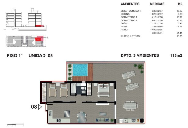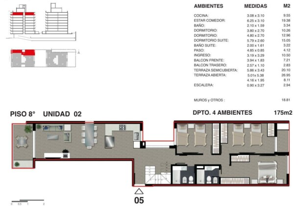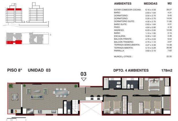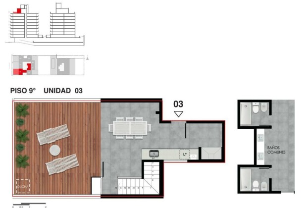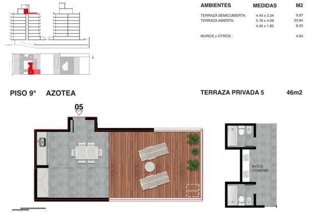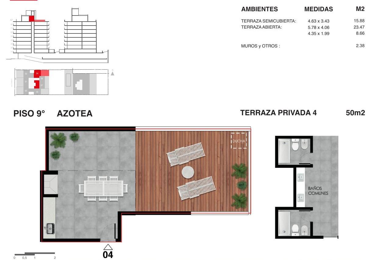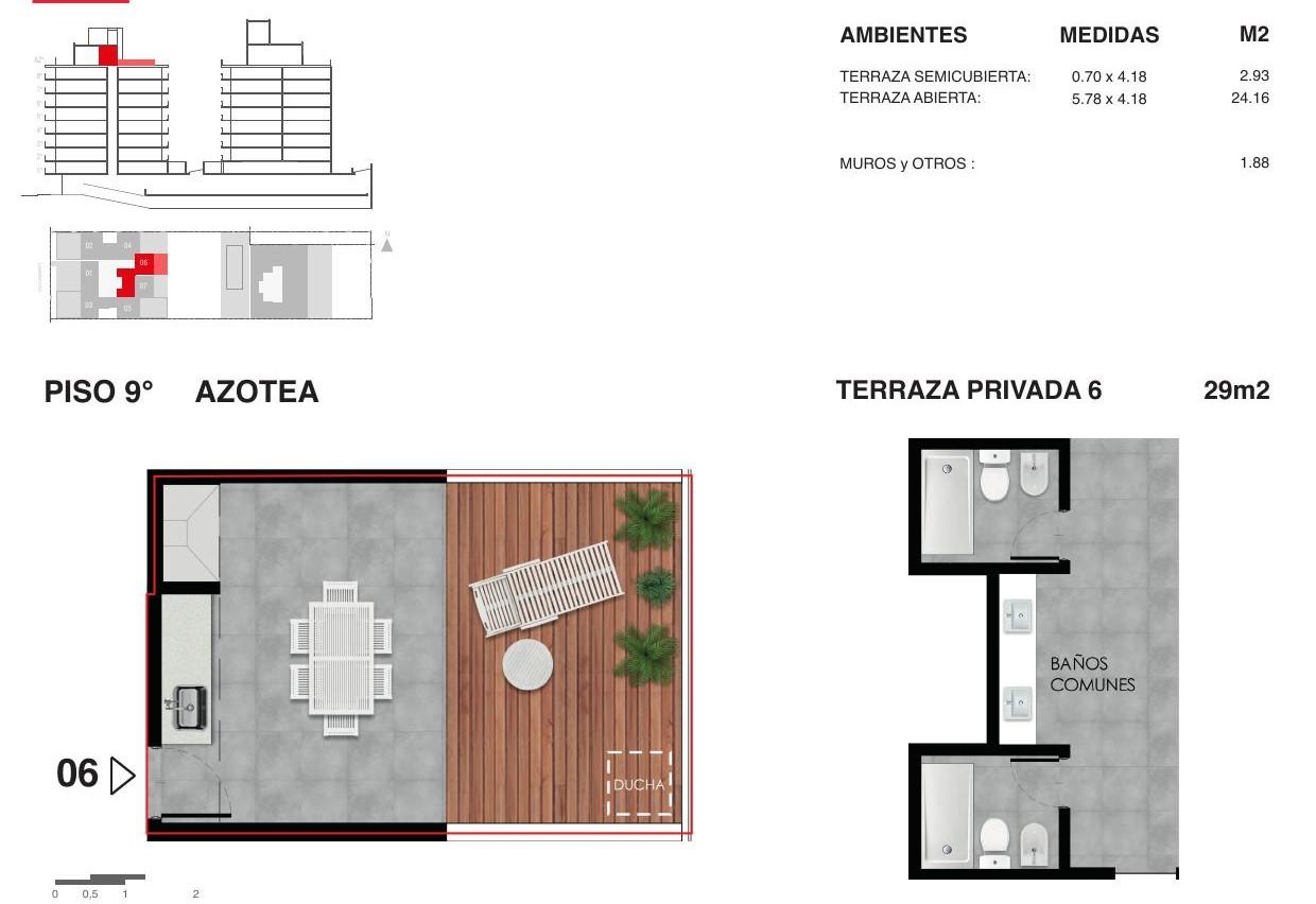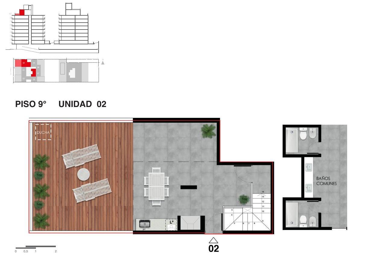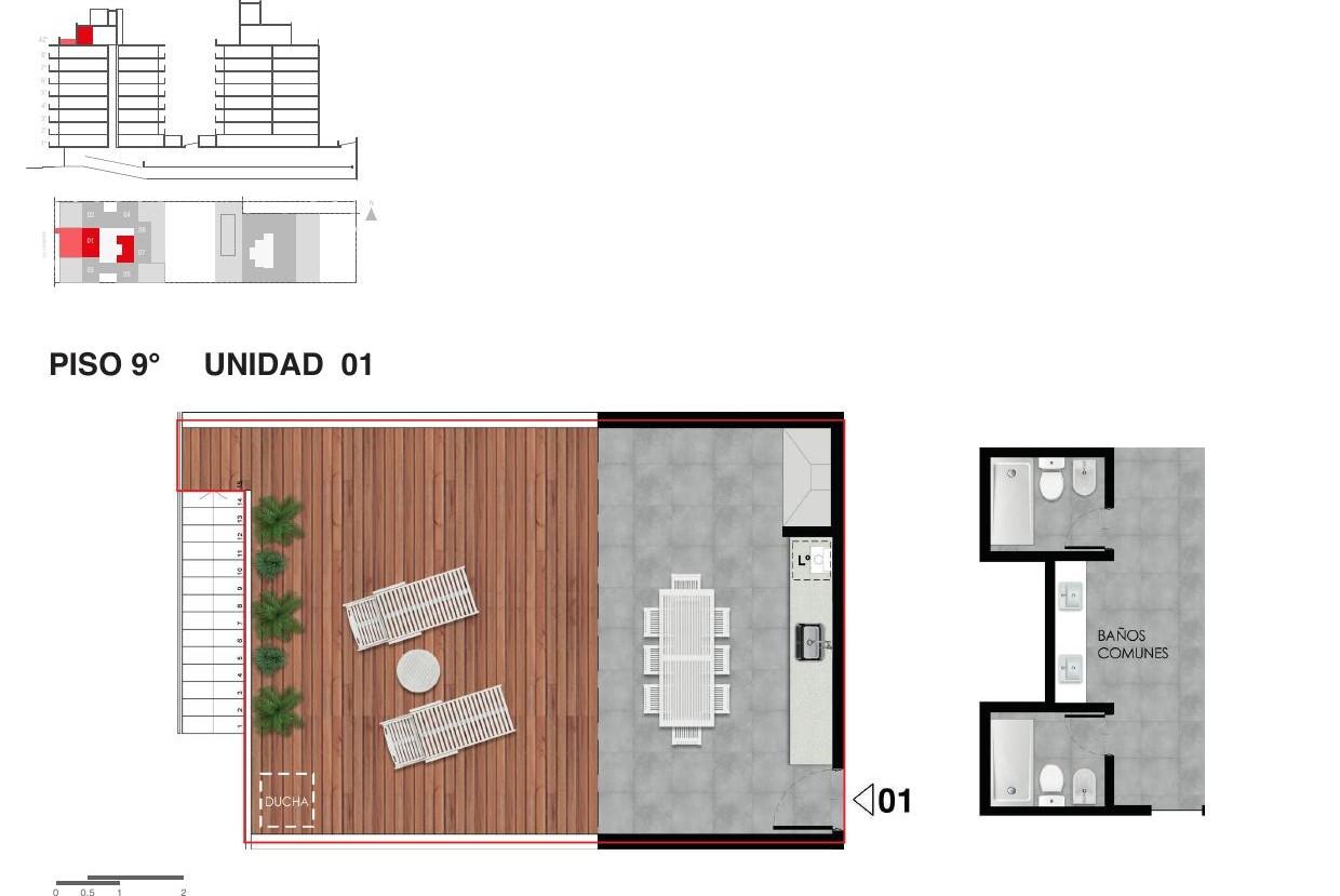Azotea con: SUM, Parrillero, piscina, solárium, ducha de uso común. Baño con ducha, gimnasio y coworking. Terrazas exclusivas: con parrillero, solárium, ducha y espacio para guardado.