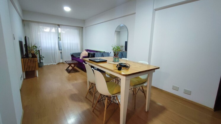 Ingreso a amplísimo living-comedor con pisos de madera parquet y ventanal con persiana hacia 9 de Julio.