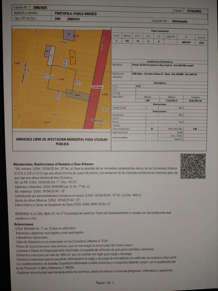 El terreno posee afectaciones por centro de manzana (muy pequeña) y no cuenta con valor patrimonial. Posee orientación este en el frente y oeste al contrafrente, se encuentra dentro de una zona AT-3. En el mismo hay edificado un galpon con unas oficinas comerciales a concluir.
