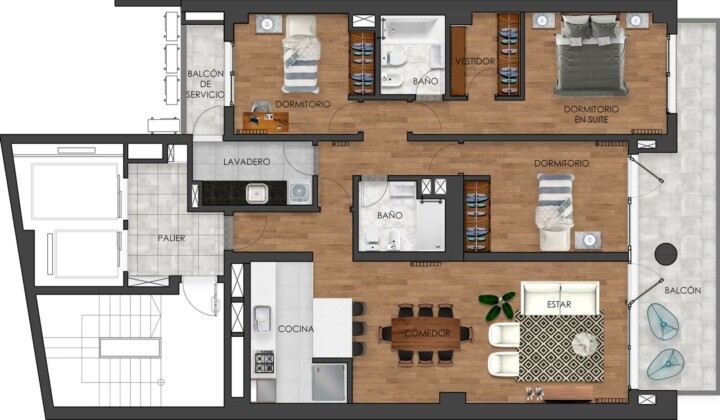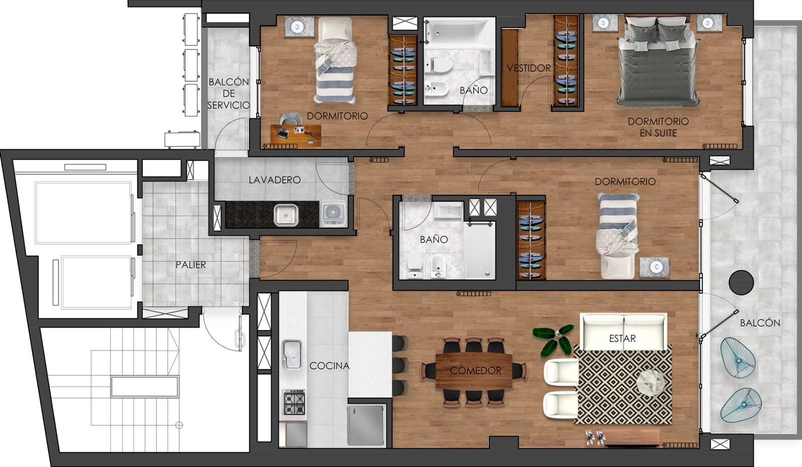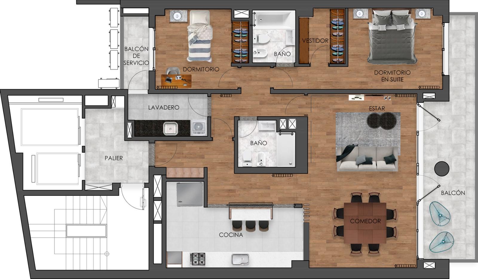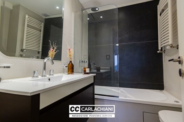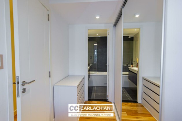 Ingreso al amplio living-comedor con cocina integrada, con acceso propio al lavadero sectorizado y balcón de servicio. 2 o 3 dormitorios, uno de ellos en suite y con acceso privado al enorme balcón al frente Noreste, al cual también se puede ingresar desde el living.