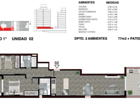 El departamento se encuentra en el piso 2° al contrafrente con orientación Sur y vistas al centro de manzana.