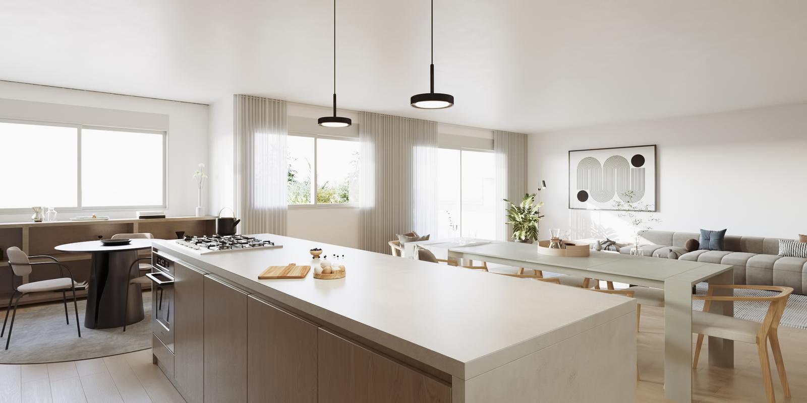 TERMINACIONES GENERALES* Pisos porcelanato simil madera.* Horno y anafe. * Purificador extensible en acero inoxidable. * Cerramiento con persianas eléctricas.* Mesada en mármol o silestone con alzada en mismo tono.* Equipos de aire acondicionado en todos los ambientes* Aberturas con DVH.* Calefacción por radiadores.* Zócalos de PVC.* Caldera dual y radiadores instalados.* Muebles de cocina y placard completos.* Baños con extractor y accesorios.