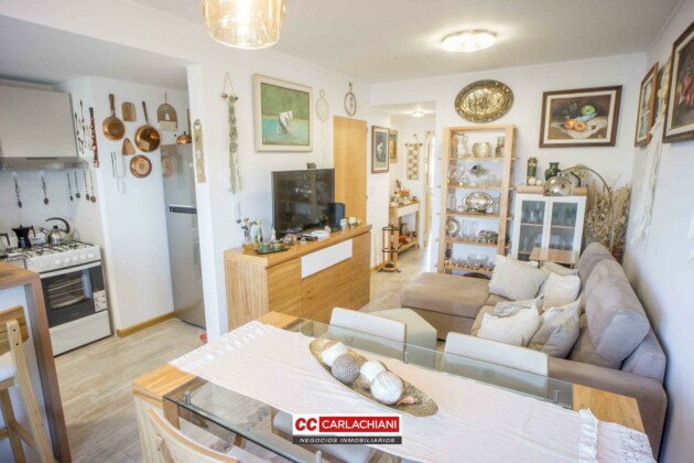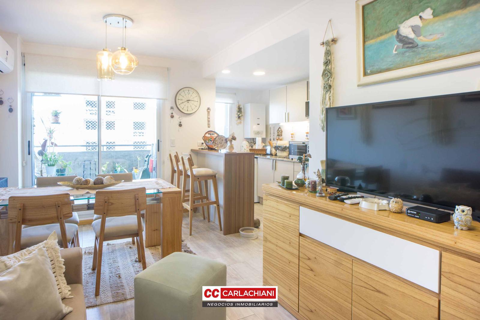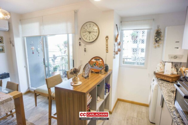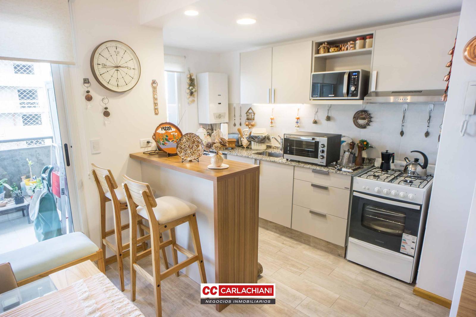 Ingreso a estar-comedor amplio con la cocina sectorizada separa por barra desayunador de madera. Equipada con alacena, bajo mesada (muebles marca Jhonson), artefacto de cocina y purificador, mas luz led en mesada.