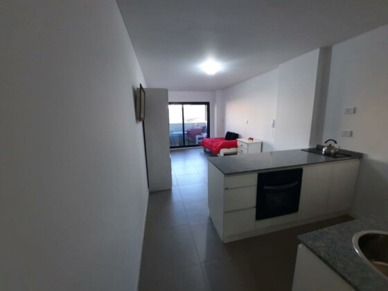 Departamento de excelente calidad próximo al campus universitario de la UCA. Cuenta con un gran ambiente de 31 m2, con cocina semi integrada con barra, muy buena capacidad de guardado con alacenas y bajo mesada. Mesada de granito gris, anafe de vitrocerámica y horno eléctrico empotrados. Pisos de porcelanato, aberturas de aluminio con DVH y vidrios tonalizados. Orientado al Este con vista al centro de manzana.