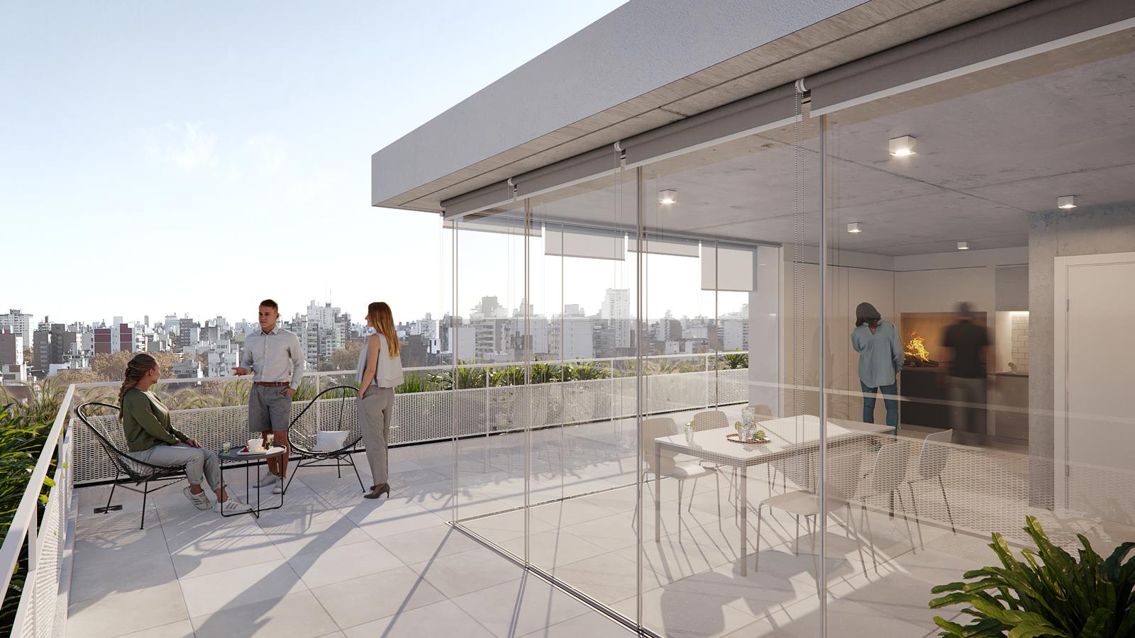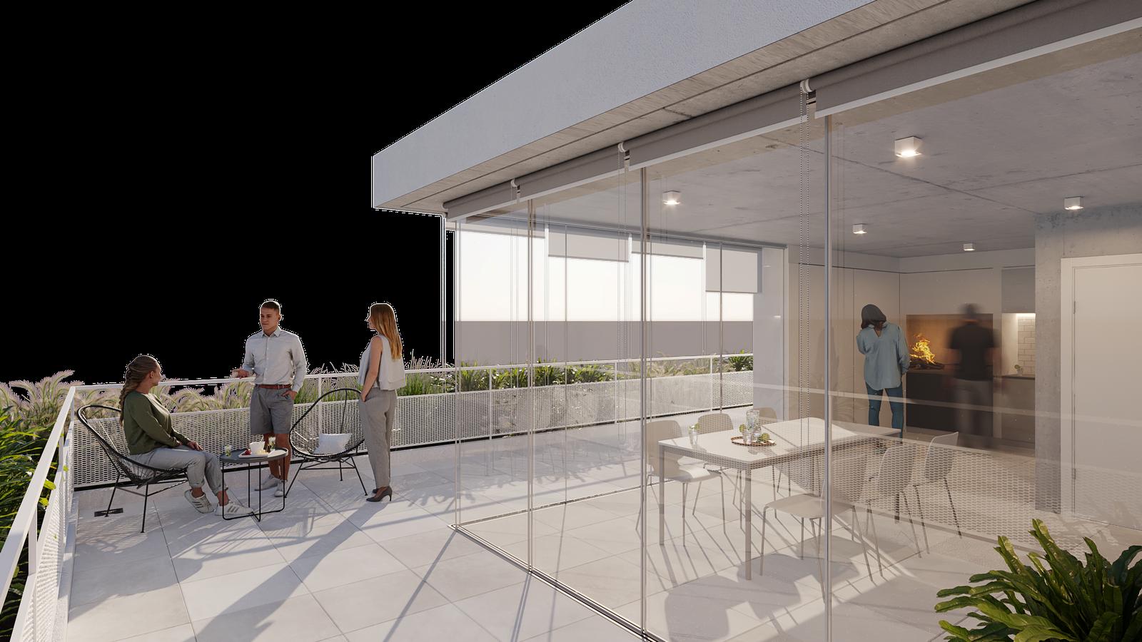 Ofrece cocheras en planta baja, un quincho equipado con parrilla y baño, vegetación decorativa y luminarias. También cuenta con ingreso con portero, buzón para departamentos y mobiliario completo para el quincho.