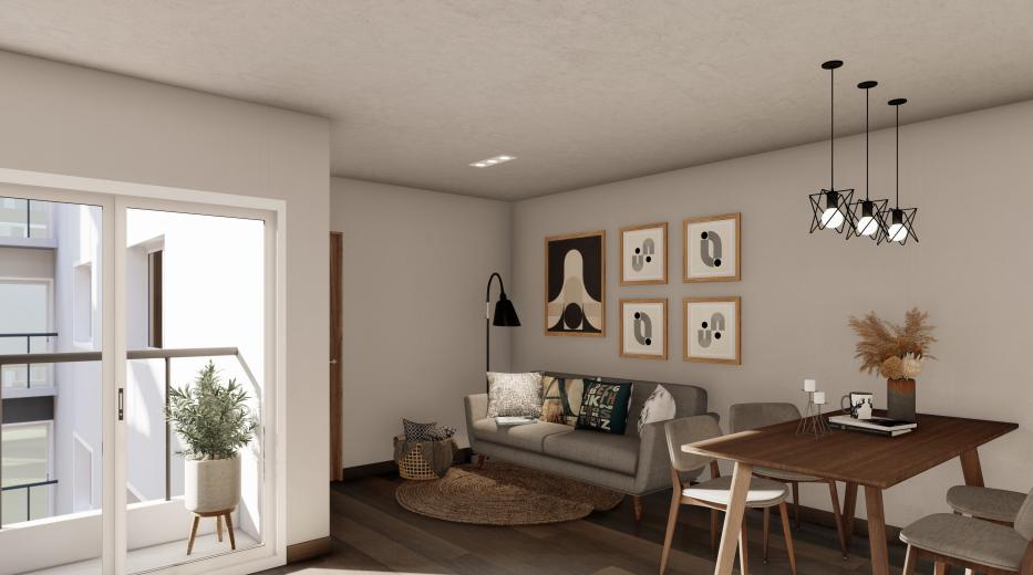 Un dormitorio al frente con cocina integrada al living, dormitorio con placar frente e interiores, balcón.