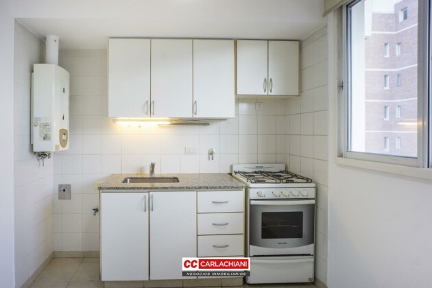 Cocina independiente completa, con alacenas, bajo mesada, artefacto de cocina y calefón a gas instalados.