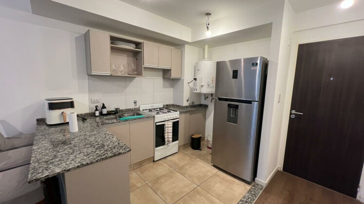 Ingreso a estar-comedor con pisos de madera flotante, y sector de cocina incorporada muy equipada (alacena, bajo mesada, artefacto de cocina y termotanque a gas instalados).