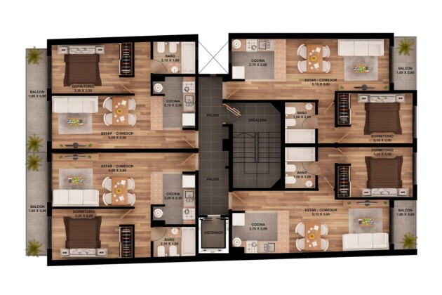 . Puerta de ingreso al edificio con cerradura magnética.. Ascensores con puertas automáticas.. Aberturas de aluminio de 1º línea color blanco.. Pisos flotantes en dormitorios. Porcelanatos en cocina, living comedor e íntimos.. Pisos y revestimientos cerámicos de 1º línea en baños y espacios comunes.. Accesorios y amoblamiento de primera marca.