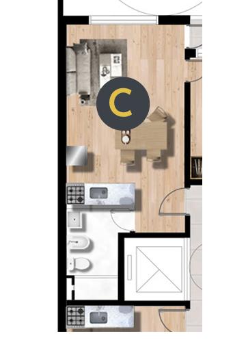 Departamento en construcción al contrafrente . Monoambiente y oficina , cocina integrada y baño completo.