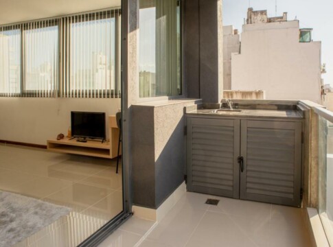 En el ultimo nivel se encuentran los amenities . En una de las terrazas, un espacio social con solárium y duchas y en la otra un SUM para 14 personas equipado con red WI FI, parrillero, heladera, mesas y sillas.