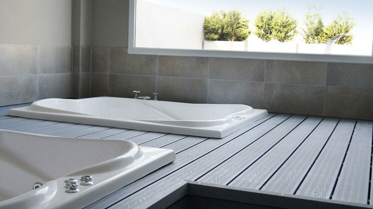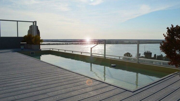 Piscina con solarium y deck de madera con vista panorámica al río Paraná. | Quincho con doble parrillero y salón de juegos con vista panorámica al río. | Pileta interior con hidromasaje y vista panorámica al río.