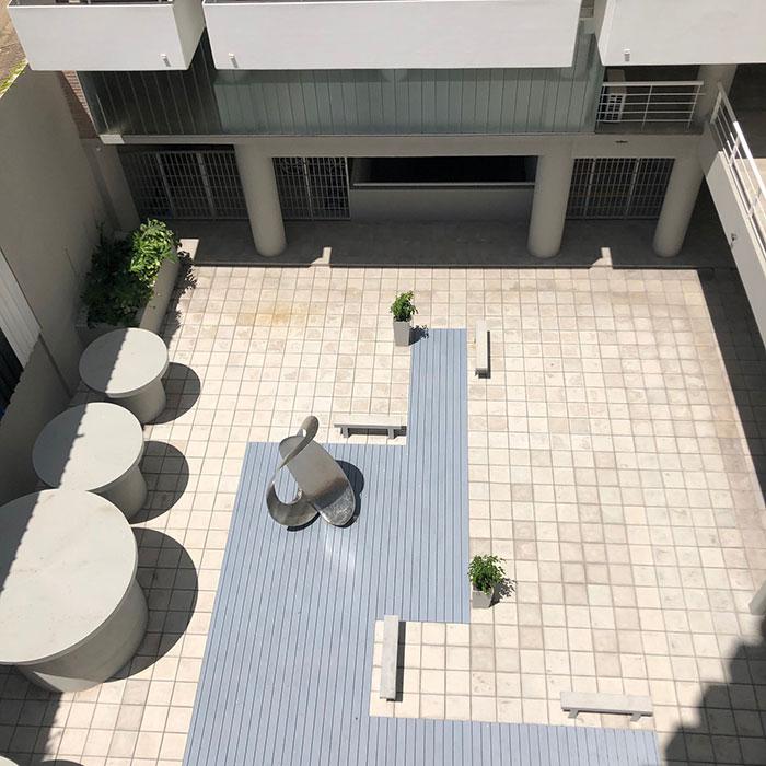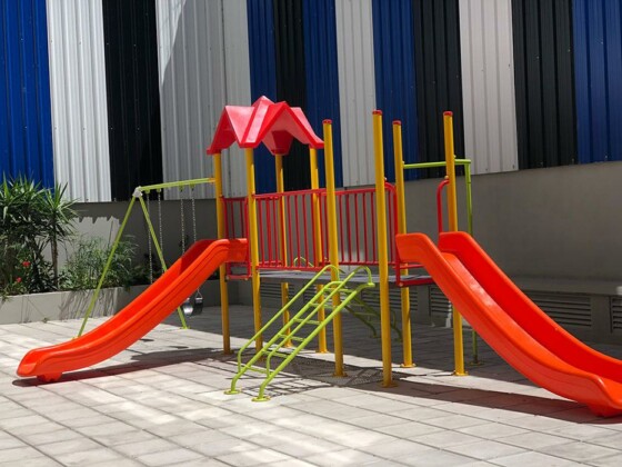 Patio recreativo con juegos para niños y deck con mobiliario urbano. | Sala blanda para niños pequeños. | Bicicletero cubierto. | Espacio para motocicletas cubierto.