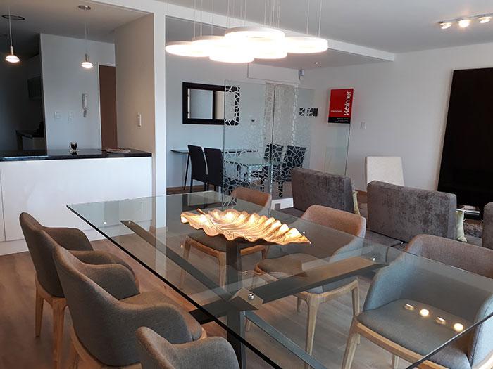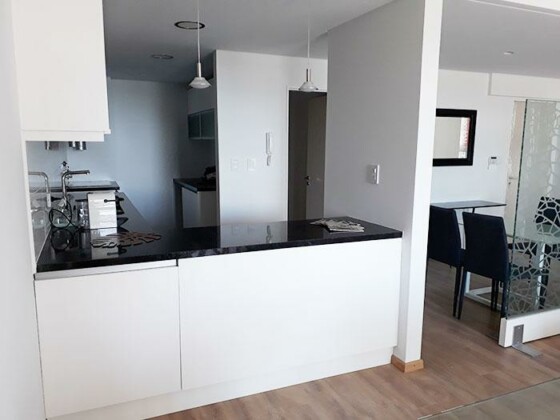 Semipiso compuesto por estar comedor amplio con salida a balcon con vista a Rio y Al Monumento. cocina semi integrada con barra pasaplatos (alacenas y bajomesadas de muy buena calidad, baño completo y 2 dormitorios con placares empotrados (el principal con vestidor y baño en suite) cin salida a abalcon de contrafrente. Esta unidad viene con una cochera doble y baulera.