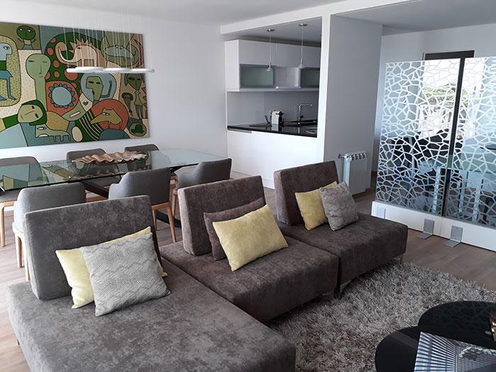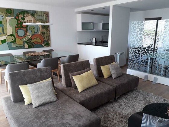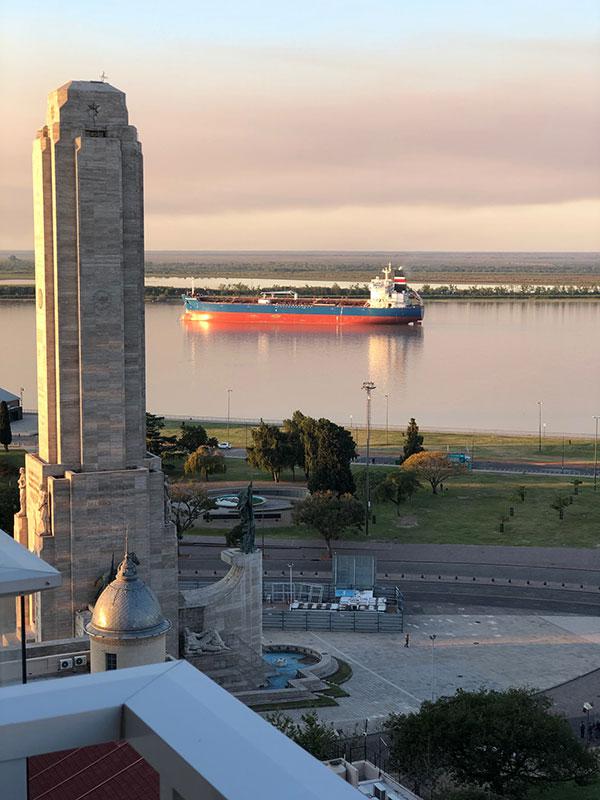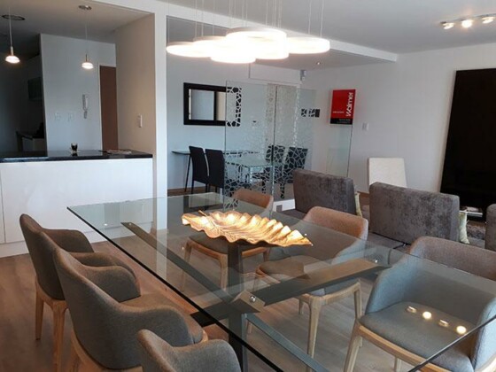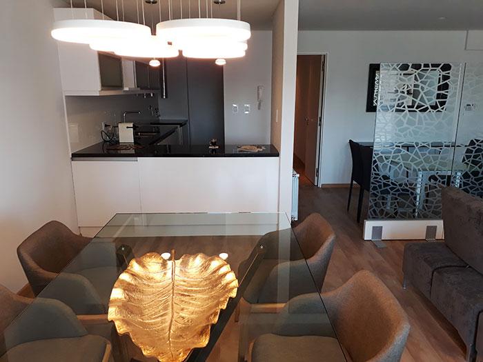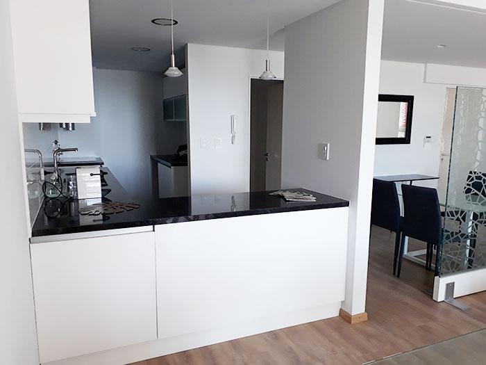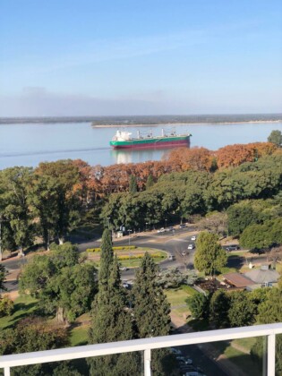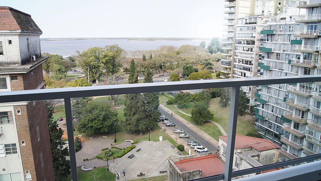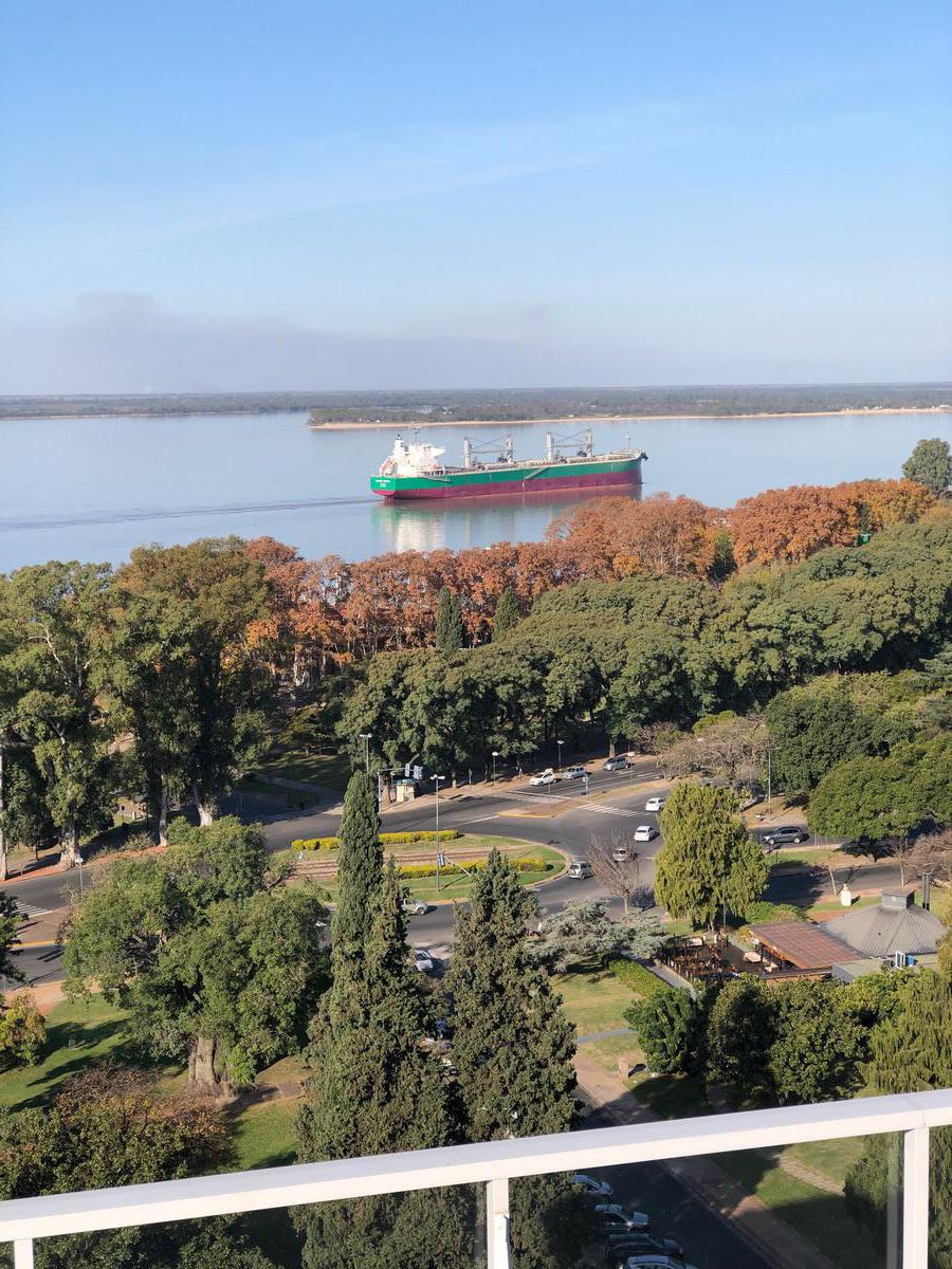 Semipiso compuesto por estar comedor amplio con salida a balcon con vista a Rio y Al Monumento. cocina semi integrada con barra pasaplatos (alacenas y bajomesadas de muy buena calidad, baño completo y 1 dormitorio con placares empotrados con salida a balcon de contrafrente y comodin que puede ser usado como dormitorio/vestidor/oficina Esta unidad viene con una cochera simple y baulera.