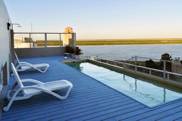 Piscina con solarium y deck de madera con vista panorámica al río Paraná. | Quincho con doble parrillero y salón de juegos con vista panorámica al río. | Pileta interior con hidromasaje y vista panorámica al río.