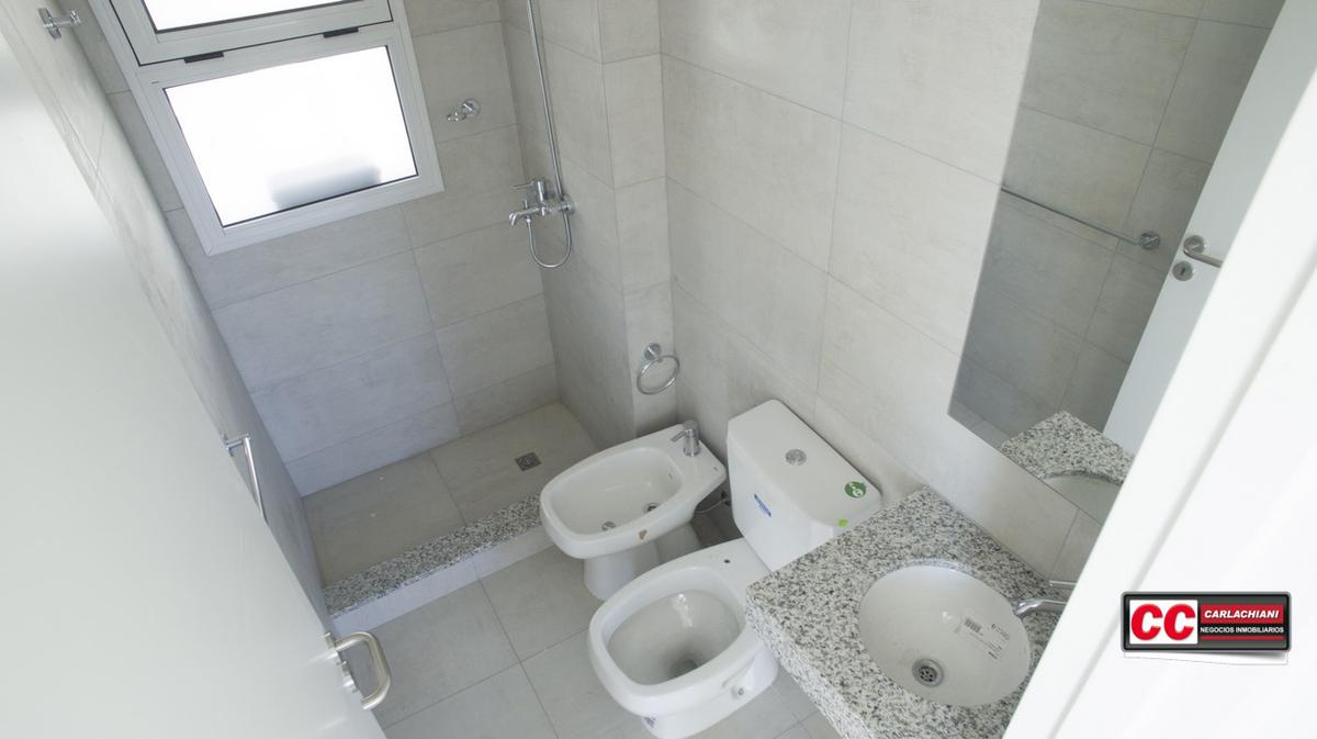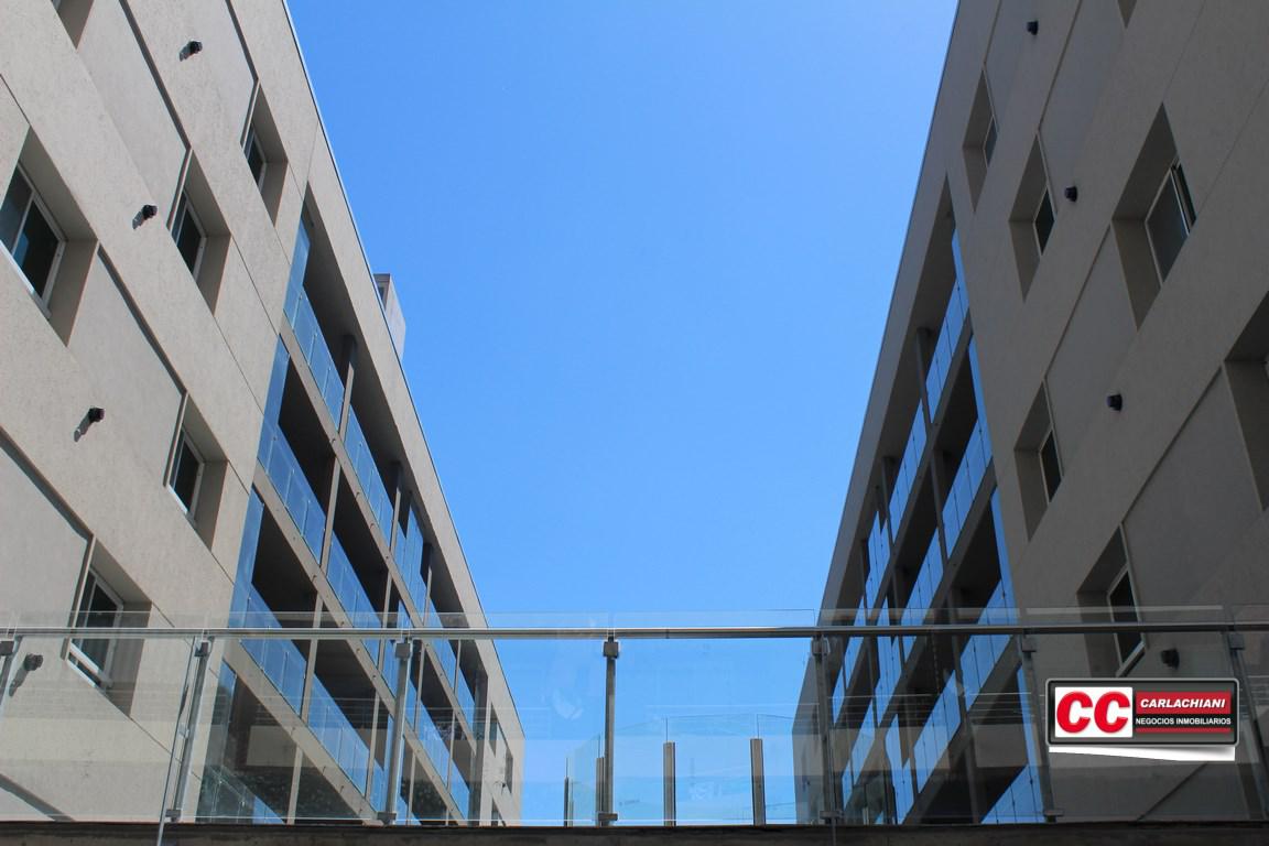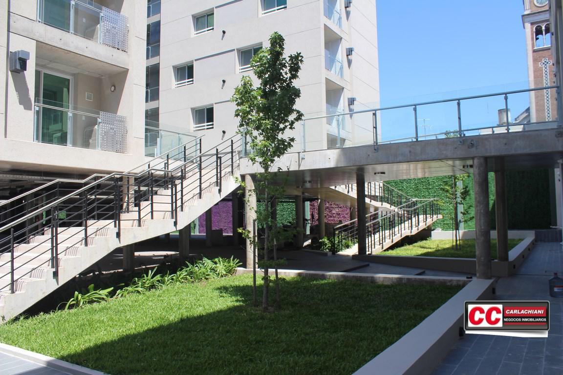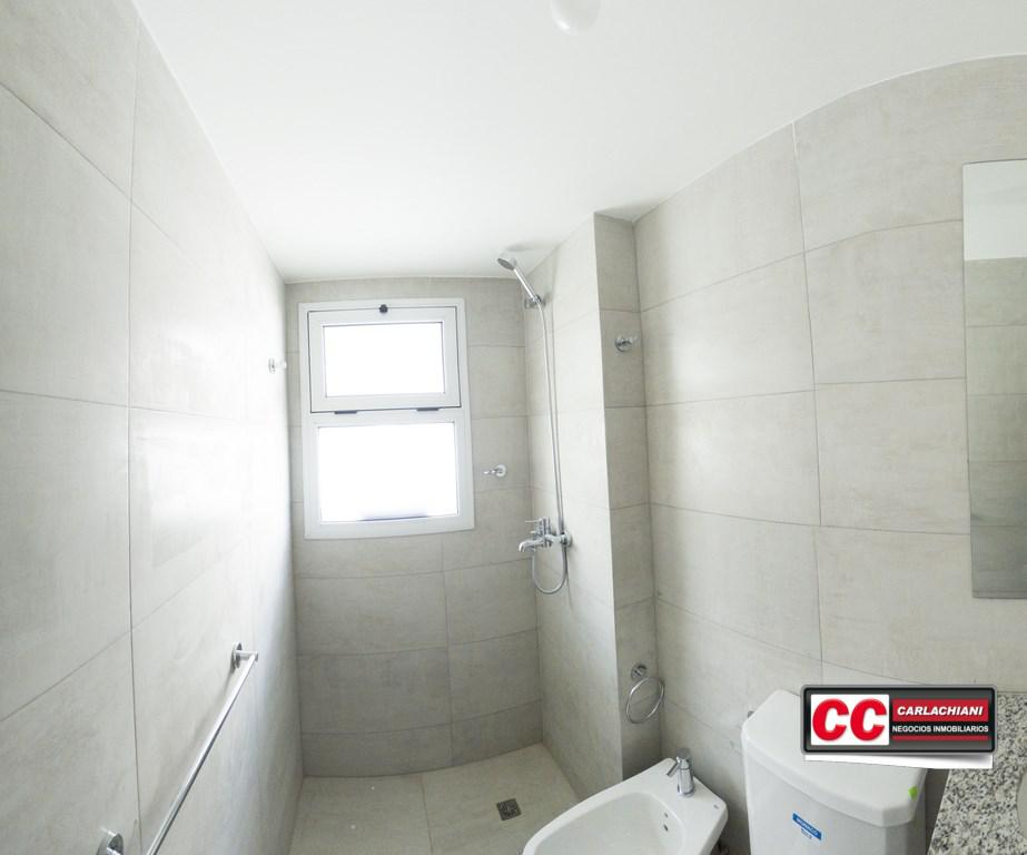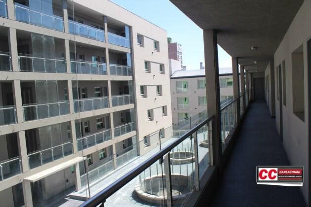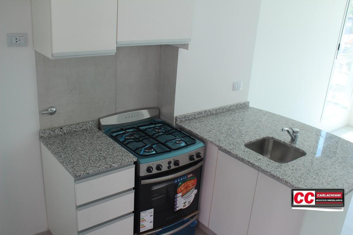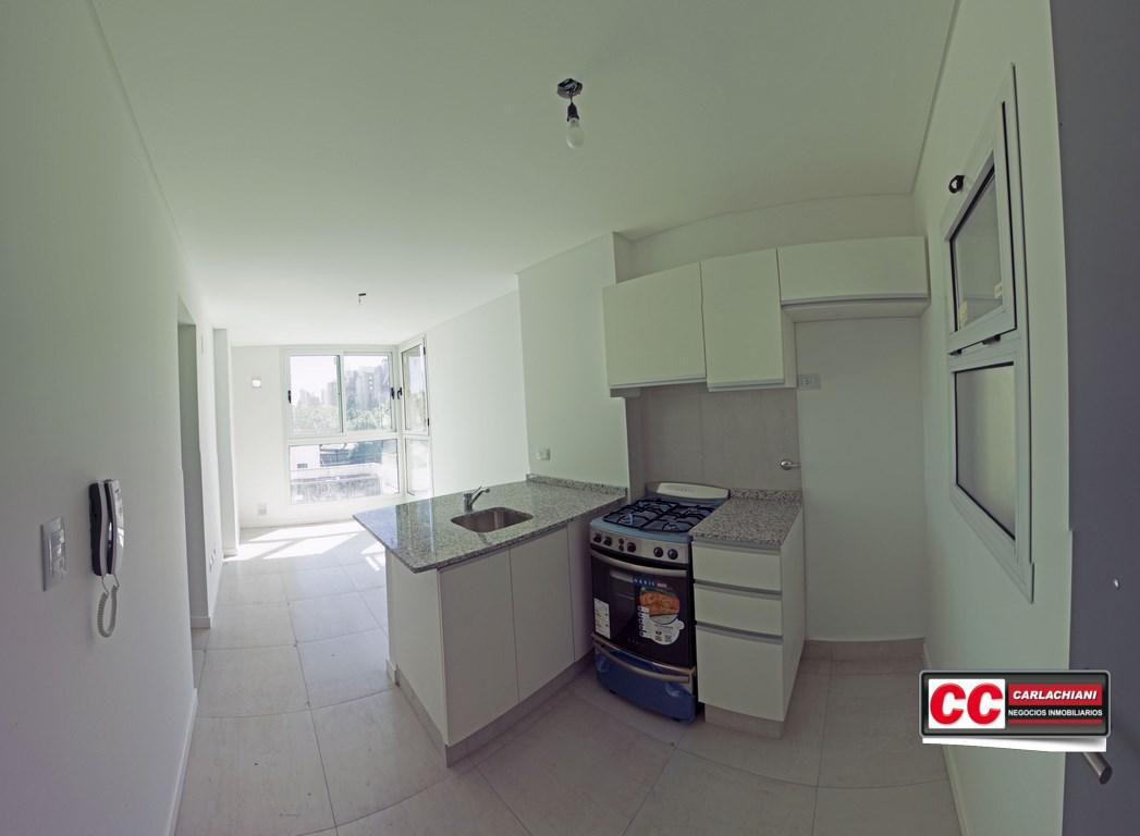Departamento de 1 dormitorio en torre interna con ingreso a living-comedor y cocina incorporada equipada y completa con bajo mesada, alacena, bacha de acero inoxidable, artefacto de cocina, termotanque eléctrico y gran barra/mesa desayunador.