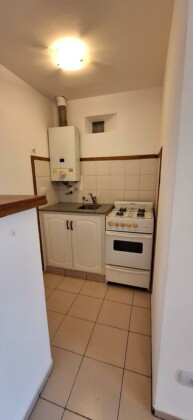 Ingreso a estar-comedor con sector de cocina semi integrado separado por barra, con bajo mesada, mas artefacto de cocina y calefón a gas.