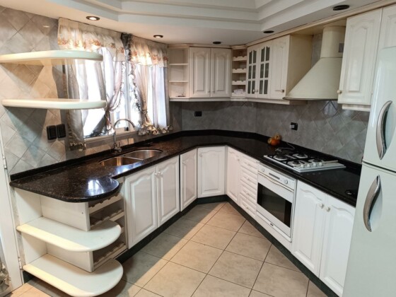 . Cocina-Comedor separada, con muebles a medida blancos con mesada de mármol negro.