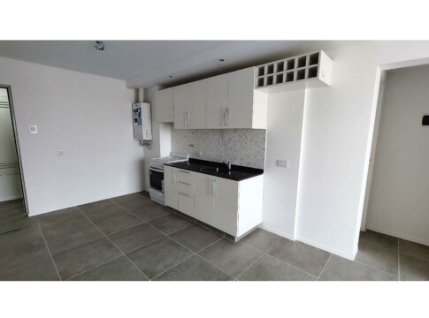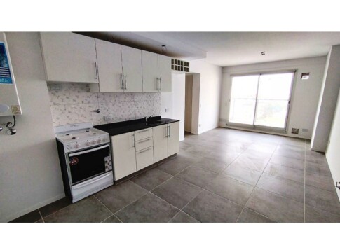 Un dormitorio al frente con cocina integrada al living, dormitorio con placar frente e interiores, balcón.