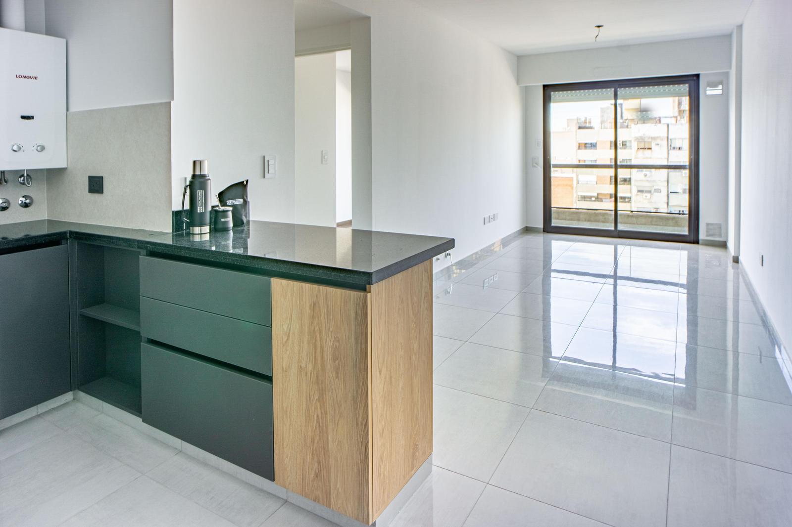 Ingreso a estar comedor con cocina semi integrada completa con doble bajo mesada (una tipo barra hacia el estar), alacenas, artefacto de cocina y calefón instalados.