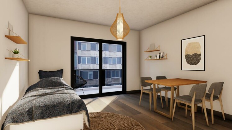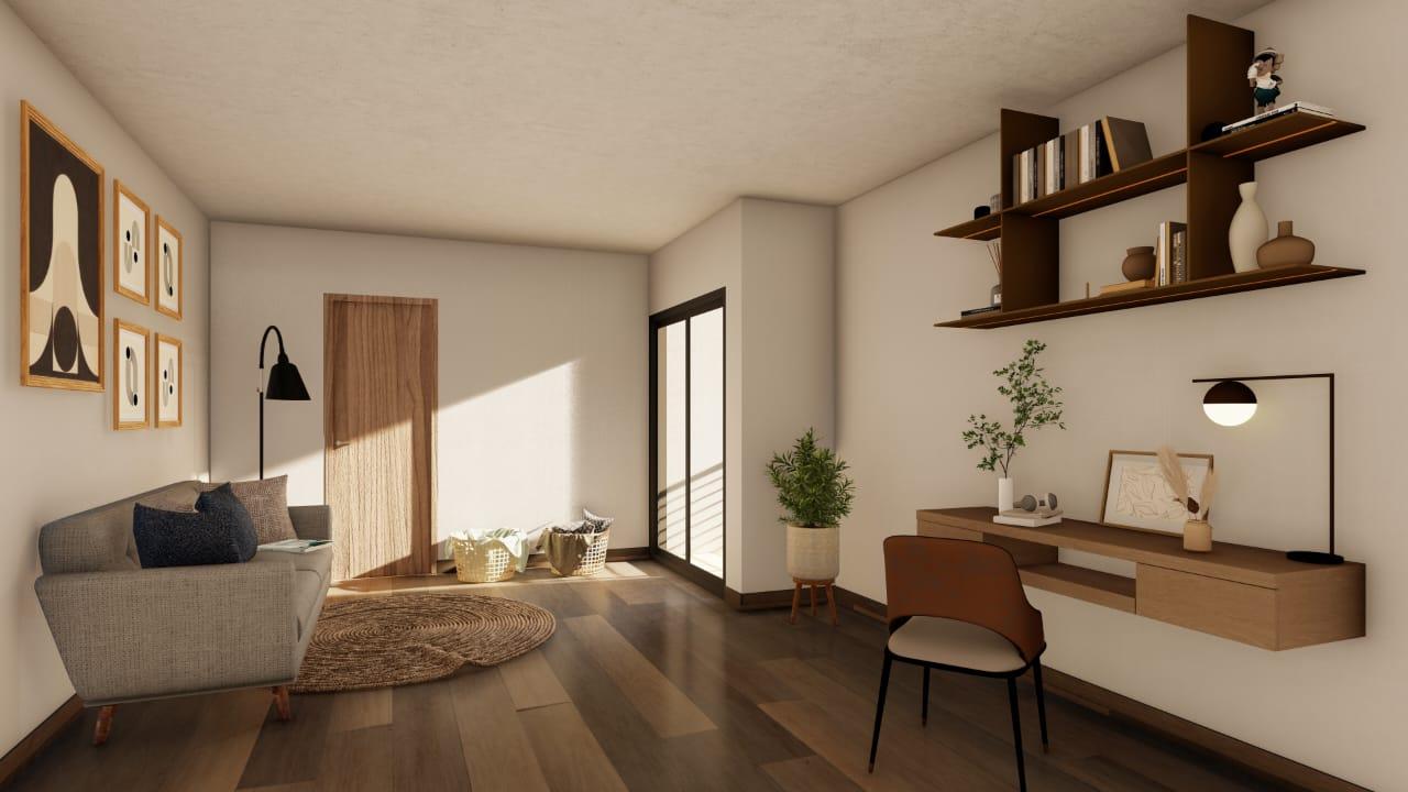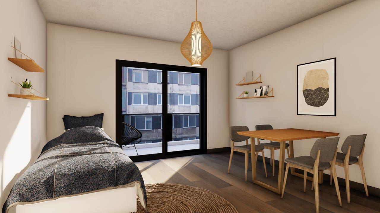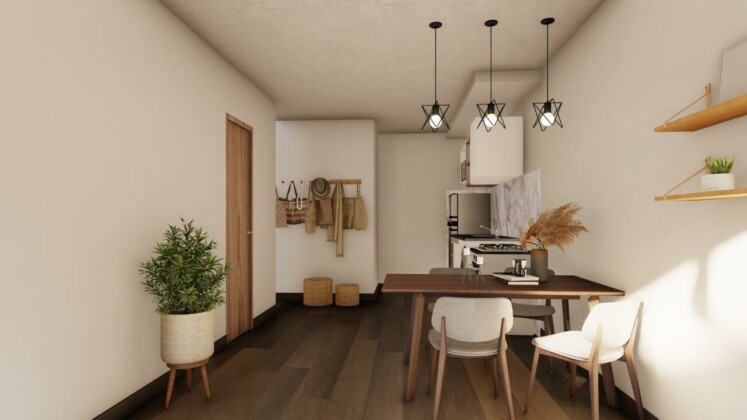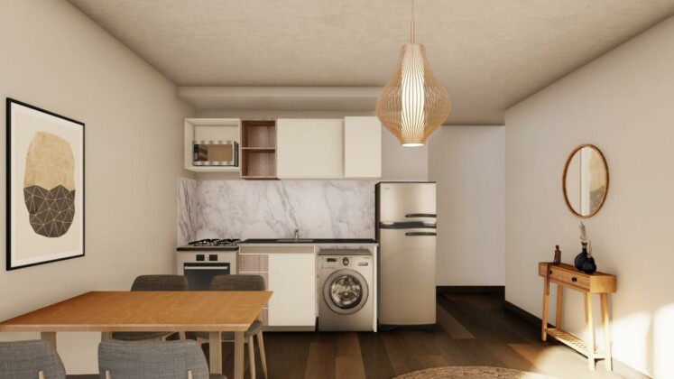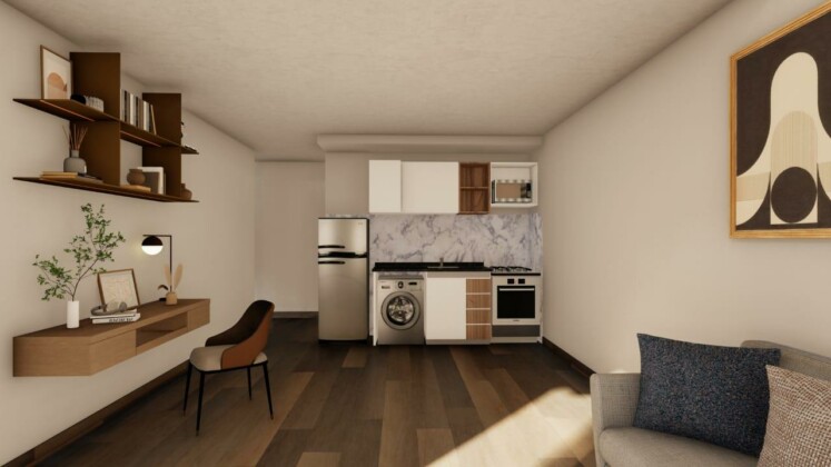 El departamento, situado en el séptimo piso de un edificio de ocho niveles, ha sido diseñado para maximizar el espacio y la luz natural, creando un ambiente acogedor y eficiente. Dispone de un dormitorio, un baño completo y un área de estar que integra cocina y comedor, perfecta para disfrutar de momentos de relajación o entretenimiento.