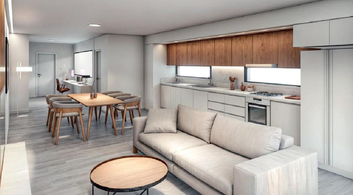 Departamentos. Aberturas de aluminio y vidrio higrotérmico.. Puertas de seguridad.. Revestimientos en porcelanato y cerámicos.. Amoblamiento de cocina completo con alacenas y bajo mesadas. Mesadas de Silestone, granito o similar.. Caldera a gas. Calefacción por radiadores (provistos). Anafe a gas. Horno eléctrico. Purificador.. Instalación para aire acondicionado, TV por cable, teléfono e internet. . Equipamiento completo de baños, con espejos y accesorios. Sanitarios y griferías.. Iluminación inteligente en baños.. Interiores de placares completos. Frente con espejos.. Espacio e instalación para lavarropas.. Balcones con mesada y grill eléctrico.