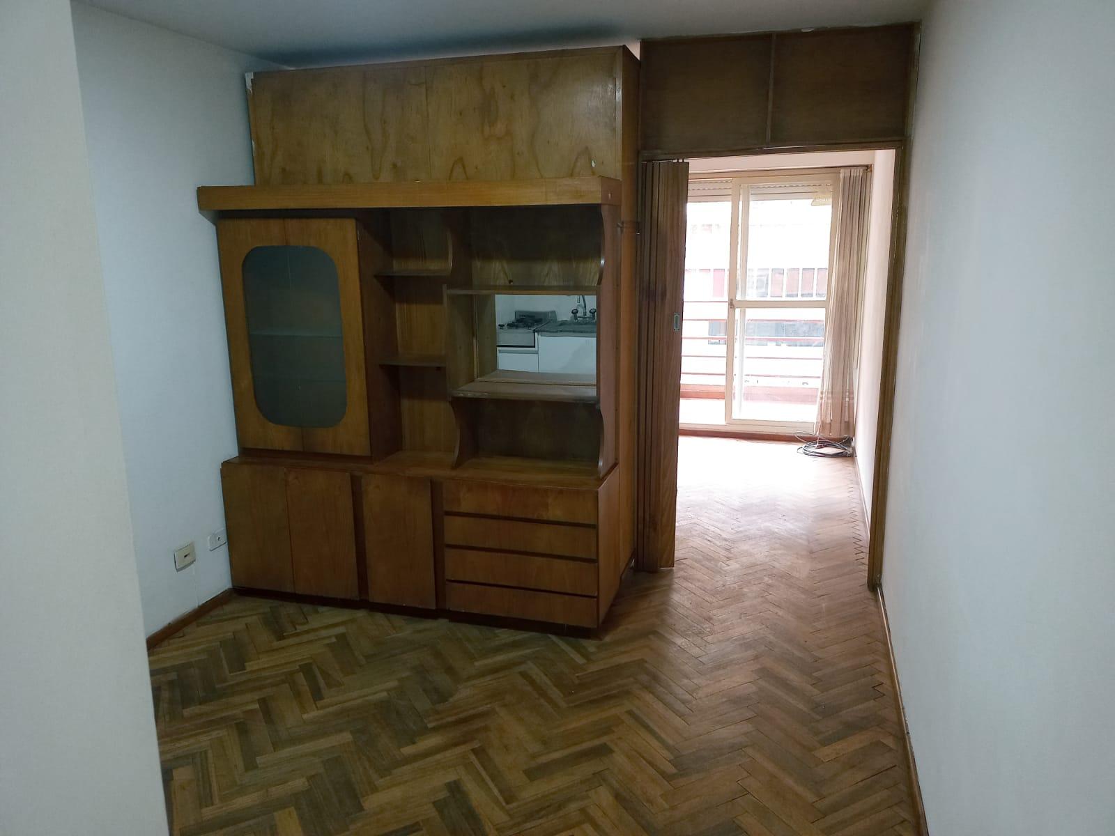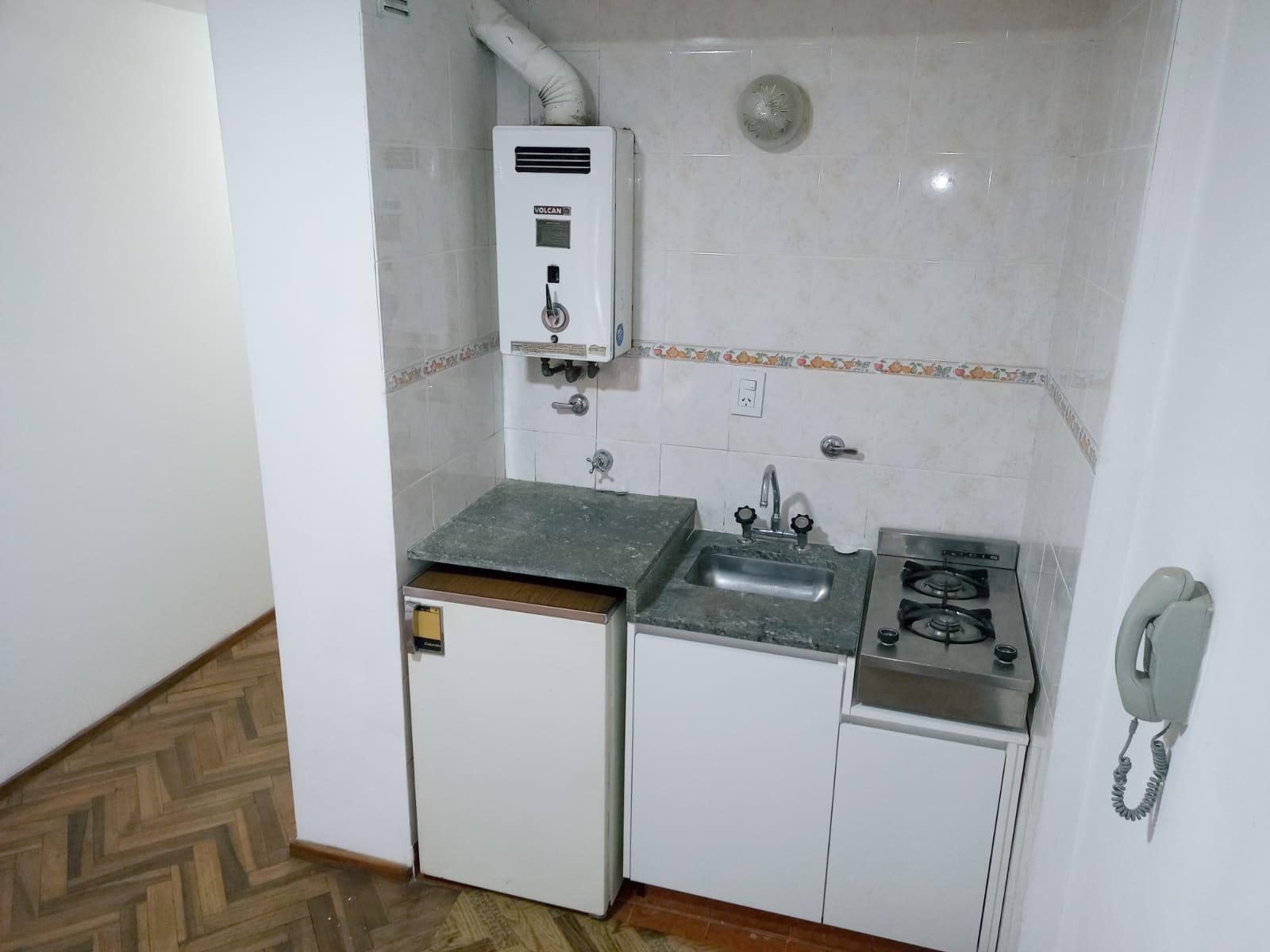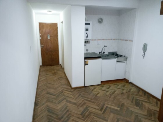 Ingreso a ambiente único dividido a 1 dormitorio, con sector de cocina incorporado (anafe y calefón a gas). Pisos de madera parquet.